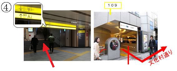(3)ファッションビル渋谷109を角に、道玄坂(黄矢印)と文化村通り(赤矢印)に道が二手に分かれていますので、右折して文化村通りへ。