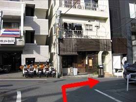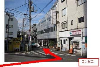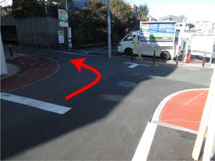 すぐに薬局やコンビニエンスストアのある少し複雑な交差点に出ますので、コインパーキングと薬局の間の道へ。