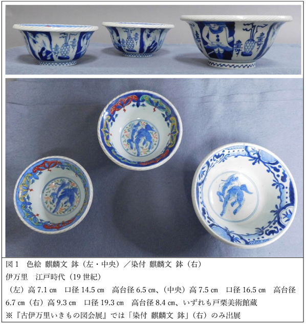 前置きが長くなりましたが、こうした時代背景を踏まえつつ『古伊万里いきもの図会展』出展の「染付 麒麟文 鉢」(図1/右)の文様を見ていきましょう。見込に麒麟文、八区画に割した外側面には壽字に籠文、ラクダ文、オランダ人文を対称に配しています。なお、今展では出展いたしませんが、見込に上絵付けを伴うサイズ違いの類品も伝世しています。