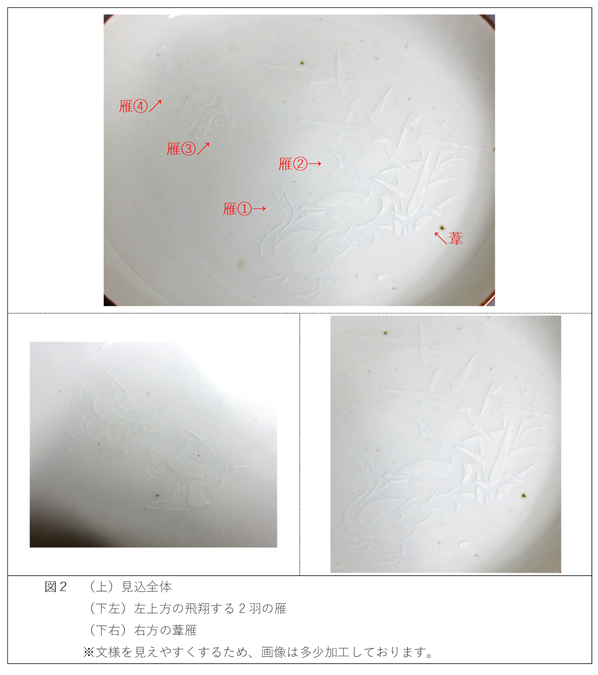 比較的キワまでしっかりと立ち上がる陽刻技法としては、文様の周囲をヘラで削り取っていく技法もありますが、その技法であらわすには本作の文様は細かすぎ、また、削った痕跡も見当たりません。そこで考えられるのが、水で溶いた化粧土を筆などで素地の上にのせるという技法。ただし、のせ方にも工夫が見られます。5客を見比べてみますと、右方の葦雁文、左上方の飛翔する雁文は、それぞれ葦の葉の枚数や雁の首の向き、大きさに至るまで同一です。また、雁文に着目すると、輪郭線が点線状になっています。これらの情報から考えるに、文様部分を切り抜いた型紙を用意し、それを素地に当て、上から刷毛で化粧土を刷り込んだ可能性が高いと言えるでしょう。ちなみに、5客の葦雁文の配置から、型紙は見込全体を覆う1枚ではなく、右方の葦雁文の分と、左上方の雁文の分をそれぞれ用意したとみられます。