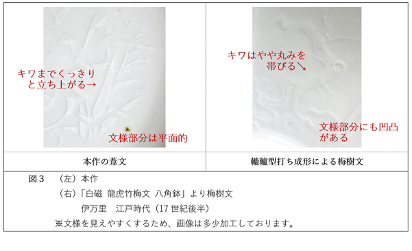 最もよく見られるのは、轆轤型打ち成形(ろくろかたうちせいけい)です。この技法は、轆轤である程度の形に挽いた後、まだ柔らかいうちに、予め用意しておいた型に被せて叩いて変形させるもの。型に彫り文様を施しておけば、その凹凸が素地に写って陽刻文様となります。轆轤型打ち成形によって細かな文様をあらわした作例もありますので本作も同技法の可能性はありますが、型で抜く場合は文様のキワが丸みを帯びる傾向があるのに対し、本作の場合はくっきりと立ち上がっています。また、轆轤型打ち成形の場合は文様部分にも凹凸を表現することが可能ですが、本作の文様部分は平面的です(図3)。
