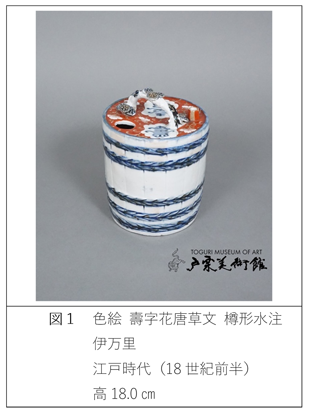 前号に引き続き、今月の学芸の小部屋も上記展覧会の出展品から、「色絵 壽字花唐草文 樽形水注」(図1)をご紹介いたします。本来は木製である結樽(ゆいだる)の形状を、磁器で模した容器です。