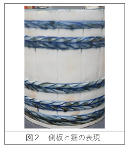 本作の造形の肝は、側面部分に施した側板(がわいた)と箍(たが)の表現でしょう(図2)。2.5センチほどの間隔で縦方向に走る凹状の筋によって側板をあらわし、箍は凸状に表現してあります。本来の素材であれば、側板を竹釘で繋ぎ合わせ、竹で編んだ箍を嵌め、底部を取り付けていくことになりますが、磁器の場合は粘土が完全に乾き切らないうちに成形をする必要があり、また素焼き前の粘土は壊れやすいため、全く同じ手順で組み立てるのは非常に困難。そのため、側板や箍はあくまでやきものの表面に施した凹凸文様として再現してあります。
