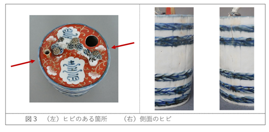 側面を見ていくと、側板の筋とは別に、縦方向にヒビが見られます。そのヒビのちょうど反対側にも、もう1本。中央を通るように側面部分を二分できるような位置関係です(図3)。側面部分を半分ずつ型に押し付けて成形し、両者を貼り合わせ、その後、底面や天面も組み立てていったのでしょう。