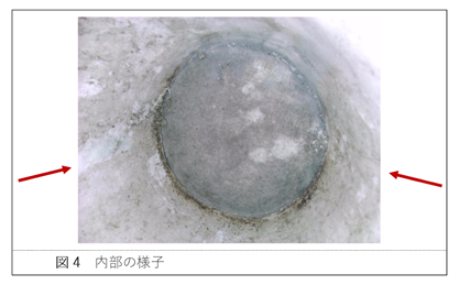 表面は成形痕が目立たないように整えてありますので、内視鏡カメラで内面も確認してみました。外側面のヒビ2箇所とそれぞれ対応する部分に、継ぎ目の粘土を撫で付けたような痕跡が認められます(図4)。また、周囲には指で粘土を押し付けた痕跡も多数。ここから、上述の通り側面部分は型押し成形で半分ずつ作って貼り合わせたものと推定できます。そして、側面部分全体が型押し成形であるならば、いずれにせよ型は用意しなければならないため、外側面の箍は型にあらかじめ施しておいた彫り文様を写し取った可能性が高いと言えるでしょう。