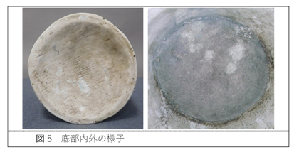 加えて、底部の様子も成形の手順を示唆しています。内部を覗くと、側面部分と底部の間には貼り合わせる際の接着剤である泥漿(でいしょう)のはみ出しや、継ぎ目が確認できます(図5)。また、底部には内外とも布目が残されています。伊万里焼の成形時には、初期の轆轤型打ち成形(ろくろかたうちせいけい)で剥離剤の代わりとしたり、型押し成形時に型に粘土を押し付ける際に布を介したりと、度々布が用いられたと考えられています。本作も、底部とするための粘土の塊は布で挟んで厚さやおおよその形を整えたのでしょう。それを側面部分が出来上がった後に押し付け、組み立てたとみられます。