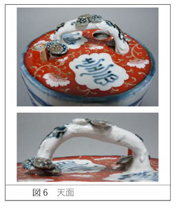 最後に、天面にも注目してみましょう(図6)。上絵の赤や金彩で花唐草文をあらわし、白く残した窓内には染付で「壽」字を書しています。凹凸文様の観点から注目したいのは、松樹をかたどった把手。幹はヘラ削りによるものでしょうか、松特有の力強い幹の様子を表現しています。また、型抜きによるとみられる松葉を根本や中程に貼付けして、松樹らしさを醸しています。貼付けの松葉は同時代の水注や花生にも施されていますので、本作のためだけに松葉の型を製作したとは考えにくいのですが、本来の結樽の素材では表現の難しい松樹の把手を付けるというのは粘土細工ならではの遊び心に溢れた作為。側面部分でしっかりと結樽の形状を再現しているからこそ、本来の素材には無い把手の存在感が引き立っています。
