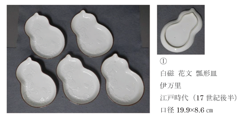 開催中の『伊万里・鍋島の凹凸文様』の会期も残すところ僅かとなりました。今月の学芸の小部屋では、出展作品から「白磁 花文 瓢形皿」(①)をご紹介いたします。