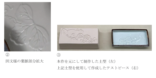 ただし、本作の場合は凹文様であらわされている葉脈が深く細いことから、型を使用して成形したあとで、別の道具を使用して葉脈を彫り込んだ可能性も否めません(②)。以前、戸栗美術館では釉薬のテストピースを作るにあたり、本作を元にした土型を制作したことがあります(③)。その際に、型で葉脈をあらわすための凸部分を元作品に合わせて細く作った結果、型を打っている最中に土型が破損。細部であっても、適切な太さがなければ耐久性が足りずに土型の劣化を早めてしまうことがわかりました。