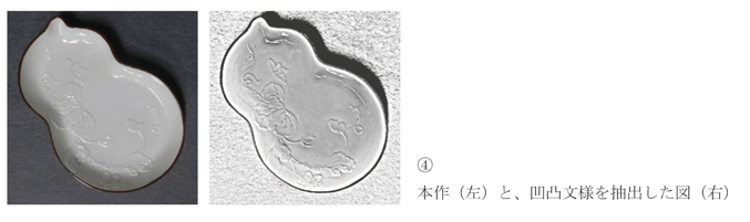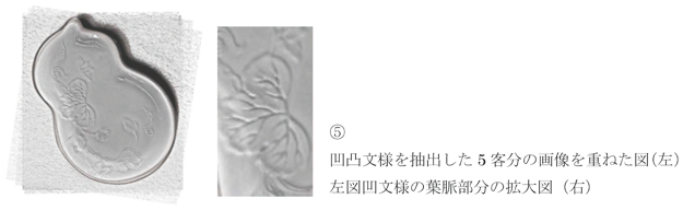 ここで言う組物とは、一揃いで伝世した作品のことを指します。本作は同形同意匠の5客揃いの組物です。1客ずつ凹凸文様の抽出を行い(④)、件の葉脈部分を軸として画像を重ねたところ、文様全体が綺麗に重なりました(⑤)。