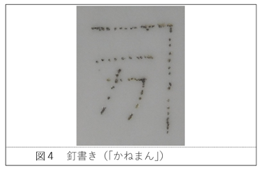 屋号の釘書きは、そのうつわの所有者(店)を示すものでしょう。しかし、店内で使用するうつわであれば、わざわざ手間を掛けて裏面に屋号を彫る必要はありません。店の外で利用する、つまり料理の仕出し(出前)の際のうつわとして使うために彫られたものと考えられます。