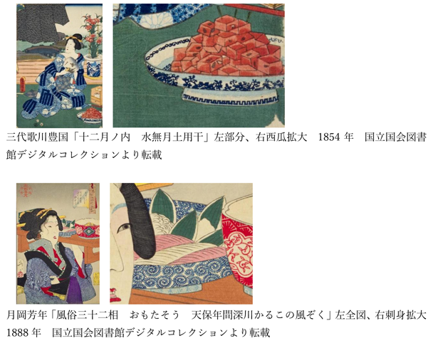 江戸の市井の風俗をあらわす浮世絵からは、うつわが与える食事への影響が垣間見えます。例えば三代歌川豊国「十二月ノ内 水無月土用干」には白地の多い染付のうつわに西瓜が盛られ、なんとも涼し気でおいしそうに見えます。一方、月岡芳年「風俗三十二相 おもたそう 天保年間深川かるこの風ぞく」では、内外を蛸唐草文で埋めた大皿に刺身が盛られています。赤身の刺身には少し青色が強く感じるうつわですが、ここではツマや大根おろしと思しき薬味の白、笹の葉の緑によって色彩のバランスが整えられており、料理が一層引き立っています。こうした料理に合わせてうつわや取り合わせを選択する心は、今も昔も変わらないように思います。