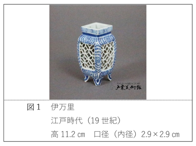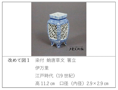 処暑を過ぎ、朝晩は少し涼しさが感じられるようになってきました。皆様いかがお過ごしでしょうか。当館で開催中の『古伊万里から見る江戸の食展』(〜9月29日(日))は会期が残りひと月となりました。今月の学芸の小部屋でも先月に引き続き、当該展覧会の出展品より、伊万里焼としては少々珍しい器種の作品(図1)をご紹介いたします。