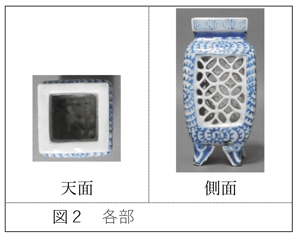 高さ11.2cmと小振りな筒状の容器で、底部には4つの足を付しています。口部は開口で口縁にも施釉し、蓋は伴いません(図2左)。最大の見どころは胴部4面に施した、七宝繋ぎ文の透かし彫りです(図2右)。透かし彫りは先端の尖った道具で素地を彫り込み、残した輪郭で文様を表現する技法です。本作では個々の輪郭が2mmにも満たない細さで、非常に繊細な仕事振り。1300℃前後にも達する本焼き焼成にも耐え、見事に焼き上がっています。七宝繋ぎ文の周囲は染付による青色で蛸唐草文を描き込み、口縁部には雷文をめぐらせています。