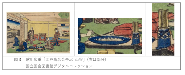 ヒントとなるのが江戸時代に描かれた浮世絵です。江戸時代の高級料理屋として著名な八百善を、歌川広重が描いた一枚を見てみましょう(図3)。右上に「狂句合」の文字が見えますので、狂句の会が催されている場面です。中央には料理や盃洗が用意され、一人の女性が大皿から料理を取り分けている様子。注目したいのはその大皿の右側で、細長い筒状の容器が描かれています。全体が青く塗られているところから、大皿と同様に染付磁器をイメージしているものと考えられます。上半部には、白抜きの七宝繋ぎ文もあらわされています。そして、本作に似たこの容器に入っているものは沢山のお箸。箸立として利用されていることが判明します。