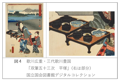 江戸時代の日本における食事は、基本的には銘々膳で提供されるもの。その場合、各々のお膳に一膳の箸が用意されました(図4)。
