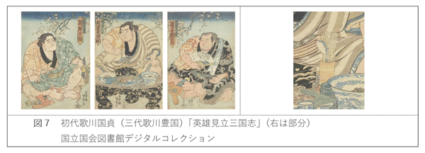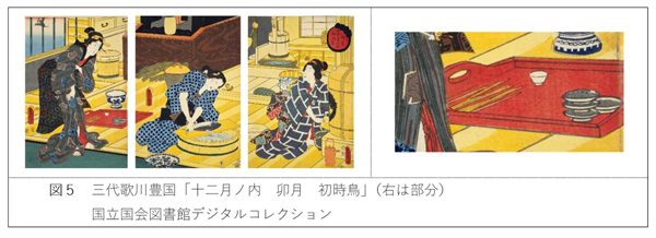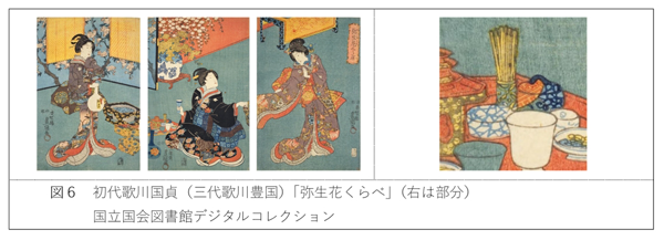 ところが、浮世絵に頻繁に食事の場面が描かれるようになった19世紀には、先ほどの八百善を示した浮世絵「江戸高名会亭尽 山谷」のように、大皿や大鉢にそれぞれ複数人分の料理を盛り、取り分けて食すという形態が広まりました。その結果、浮世絵の中にも菜箸あるいは複数人分とみられる箸がまとまってあらわされるようになりました。初鰹をさばく場面を描いた「十二月ノ内 卯月 初時鳥」では、取り分け用の小皿とともに複数膳のお箸がお盆の上に無造作に置かれています(図5)。あるいは、「弥生花くらべ」では、「江戸高名会亭尽 山谷」と同様に菜箸または複数膳とみられる箸が箸立に差してあります(図6)。なお、この箸立も七宝繋ぎ文が施されており、線が二重になっているように見える部分があること、青緑色の地に対して七宝繋ぎ文の内側は箸と同じ黄色で塗られていることから、透かし彫りを意識して表現している可能性もあるでしょう。