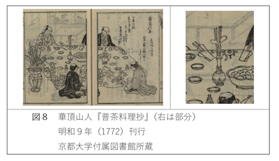 中国から流入した卓袱料理(しっぽくりょうり)や普茶料理においても、箸立の使用は確認できます。これらの場合は箸に加えて蓮華や匙も立てることがありました(図7・8)。