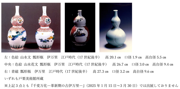 初期伊万里の時代(1610年代~40年頃)の瓢形瓶はくびれが緩やかで上半分は横に膨らみ、下半分は大きく下膨れになっているのが特徴です。ここに示した「染付 菊文 瓢形瓶」だけでなく、他館収蔵品や初期伊万里を産した佐賀・武雄の百間窯からの出土陶片にも同様の特徴が見られます。