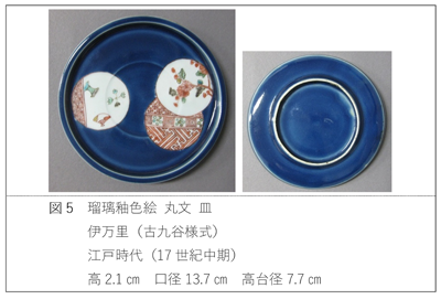 「瑠璃釉色絵 丸文 皿」の場合は、菊花や扇、鼓、幾何学文などを描いた丸文部分は透明釉を塗っていますが、そのほかは裏面や高台内に至るまで、畳付を除いて総体に瑠璃釉を施し、ほとんどムラは見られません(図5)。よって、丸文部分に撥水剤を塗るなどしてマスキングしておき、液体状の瑠璃釉にくぐらせて全体を施釉、畳付をぬぐって、マスキングを除去した後に丸文部分に筆で透明釉を塗り分けたと考えられます。ちなみに、丸文内の文様はすべて上絵付けですので、本焼き焼成が終わった後に施しています。