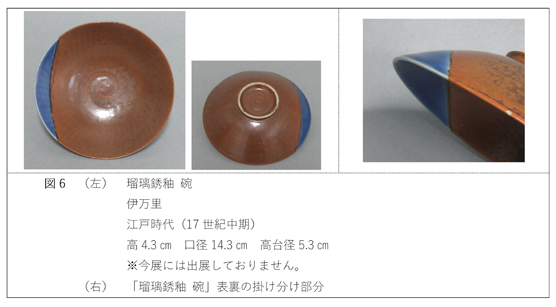 筆は使わずに2色以上の釉薬を施す方法もあります。「瑠璃銹釉 碗」は、銹釉を主体として瑠璃釉を部分的に施釉した平茶碗(図6)。表裏の施釉箇所が一致することから、液体状の釉薬に碗の片側だけ浸し、乾いたところで反対側をもう一色の釉薬に浸したものでしょう。文字通り釉薬を「掛け分け」た作例と言えます。