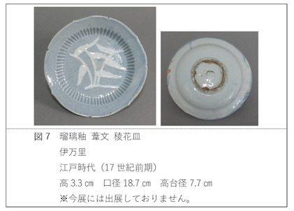 最後に、「掛け流し」の例もご紹介いたします。時代は上りますが、「瑠璃釉 葦文 稜花皿」は表面に淡い瑠璃釉、裏面には透明釉を施し、見込に葦文をあらわした作品(図7)。表面の瑠璃釉は、柄杓などで掬って掛け流したものと推測され、裏面にも多少の釉垂れが生じています。