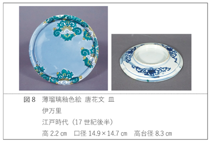 そして、その一部は前期の鍋島焼にも受け継がれていきます。17世紀後半の中でも早い段階の作例である「薄瑠璃釉色絵 唐花文 皿」は、表面に掛け流した淡い瑠璃釉が裏面にも大胆に垂れています(図8)。「瑠璃釉 葦文 稜花皿」にあるような掛け残しは見られず、裏面および表面の唐花文部分は透明釉を施していますので、表裏の掛け分けというよりも、表面も含めて透明釉は全体に施し、部分的に瑠璃釉を掛け流したなどの可能性が想定されます。同意匠品が数点知られていますが、いずれも大きく釉垂れしており、偶然ではなく作為的に流したものでしょう。興味深いことに、同様の意匠で、表面に掛け流した瑠璃釉が裏面にまで到達している陶片が、初期の鍋島藩窯と考えられている日峯社下窯跡(にっぽうしゃしたかまあと)から出土しています。相違点として、日峯社下窯跡出土品は高台が高く、鋸歯文をめぐらせており、鍋島様式の萌芽が認められます。前期の鍋島焼の変形小皿には、他にも表裏に別色の釉薬を施し、かつ掛け流しによる釉垂れが裏面に渡る作例があり、釉垂れは偶発的なものでは無く、当時好んで作られていた「景色」と考えられます。