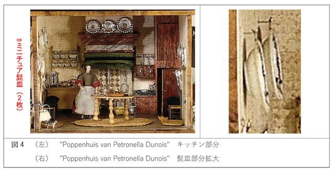 そして、注目すべきは1階中央のキッチン(図4)。金属製の調理器具や食器類が並ぶ中、左側壁面の上方に陶磁器製とみられるミニチュア髭皿が2枚掛けられています。画像からは分かりにくいのですが、髭皿の上方2箇所の孔に紐を通して、壁のフックに引っ掛けています。