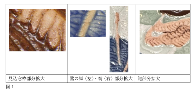 上記を踏まえると、思いのほか露胎を駆使していることに気が付きます。露胎をあらわすには、釉薬を掛けないか、あるいは掛けた釉薬を取り除く必要があります。本作は細やかに露胎を残していることから、蝋などのマスキング材の使用を想定していました。しかし、見込の窓枠に施した斜線の端にのみ、周囲の釉薬が入り込んでいる部分が複数確認できました。同様に、鷺の脚も背景の瑠璃釉が輪郭線際に入り込んでいます。嘴も輪郭線際は胴部の透明釉が載っているほか、龍にも周辺の釉薬が載っている部分が確認されました。いずれも、輪郭線や境界線の際にしか現れていない上に、部分的な現象であることから、露胎としたい部分を避けながらの施釉だったのではと推察します(図1)。