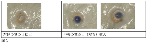 露胎とした中でも鷺の目に関しては部分的に剥がれており、他とは少し状況が異なります。恐らく、筆で鷺を施釉したのち、目の部分に及んでしまった透明釉を綿棒のようなもので拭ってから、瑠璃釉を施したのでしょう。それであれば、拭いきれなかった透明釉が中途半端に残っているのも頷けます。細かいことですが、色釉(有色の釉薬)は存外デリケートで、他の釉薬の影響を受けやすい傾向にあります。思えば、左側の鷺の目の瑠璃釉は控えめな発色ですが、瑠璃釉の厚みも薄く、釉下に残った透明釉の影響で釉中の呈色剤の割合が崩れてしまったのかもしれません(図2)。