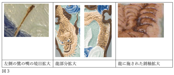 また、基本は露胎ですが、見込左側の鷺の嘴の境目と、口縁際の龍には露胎とした上に部分的に銹釉を施しています。筆の動きを感じられるほど濃淡が現れた薄掛けで、口縁部分や雲に施した銹釉とは異なる趣です(図3)。
