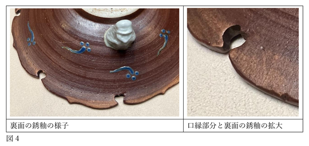 じつは、厚みの異なる銹釉は裏面にも見られます。一見すると表面の雲の銹釉と大差ないように思いますが、口縁の銹釉との境目を観察すると、裏面の銹釉の方を薄く掛けていることがわかります。また、刷毛痕のようなものが見られることから、回転台に置いて刷毛等の道具を用いて施釉したのでしょう(図4)。一口に銹釉と言っても、施し方や厚みによって表現に幅が生まれています。