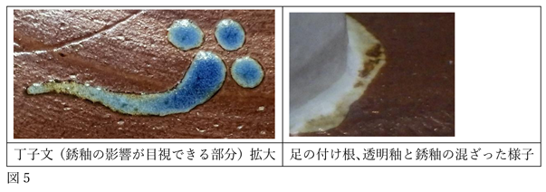 ところで、裏面の丁子文は瑠璃釉ですが、銹釉を剥がさずに重ね掛けしているとみえます。全体に表面よりも暗めの発色かつ、部分的に釉薬同士が混ざった様子も窺えます。足の透明釉がはみ出した部分も、白地の縁に同様の痕跡が見えます(図5)。