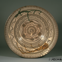 肥前陶器の中でも、佐賀・武雄を中心として17世紀前半から19世紀にかけて製作された一群を古武雄と総称します。大鉢や壺、水指などに、色釉や白化粧、鉄絵、象嵌など様々な技法を駆使してあらわす雄渾な意匠が特徴です。本作は白化粧で櫛目文を施した後、仕上げに一筋ずつ流し掛けた緑釉と褐釉が豪快な印象を与えています。